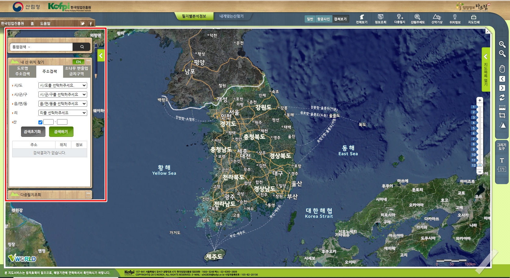 그러면 우측의 빨간박스에 있는 검색창을 이용하여 주소를 입력하고 검색하기를 클릭하면 내가 보려고 하는 임야에 대한 정보가 나옵니다.
