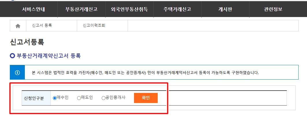 로그인을 한후 부동산거래 신고서 등록을 클릭하면 위와 같은 화면이 나옵니다.