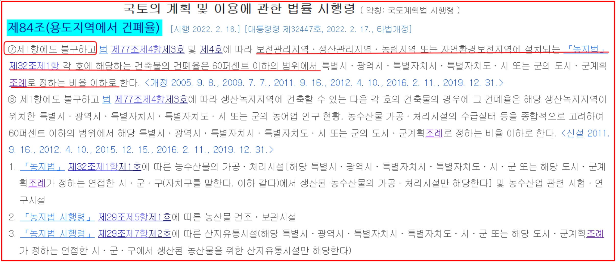 국토의 계획 및 이용에 관한 법률 시행령 제84조(용도지역에서 건폐율) 7항을 보게 되면 다음과 같이 나옵니다.