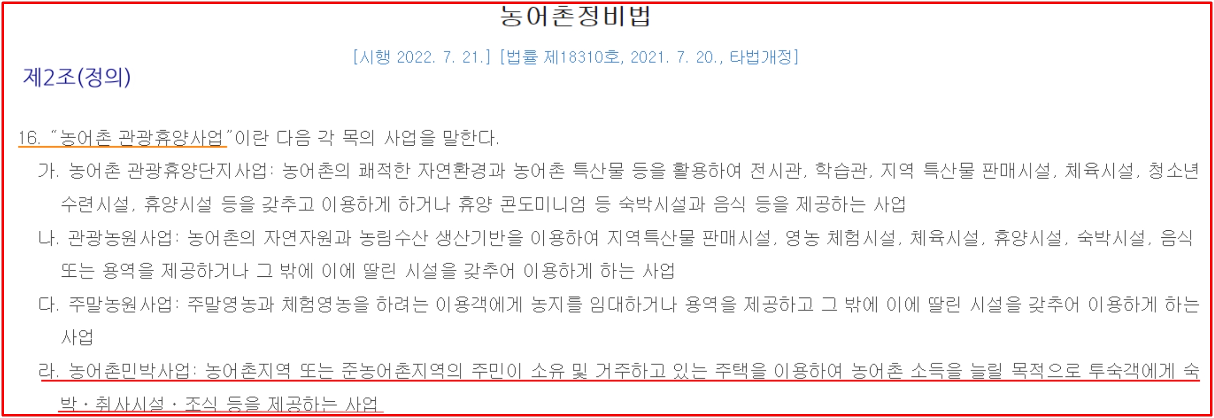 농어촌 정비법 제1장 총칙 중 제2조 중 16항 라를 보게 되면 "농어촌 민박사업 : 농어촌지역 또는 준농어촌지역의 주민이 소유 및 거주하고 있는 주택을 이용하여 농어촌 소득을 늘릴 목적으로 투숙객에게 숙박, 취사시설, 조식 등을 제공하는 사업"이란 말이 있습니다.