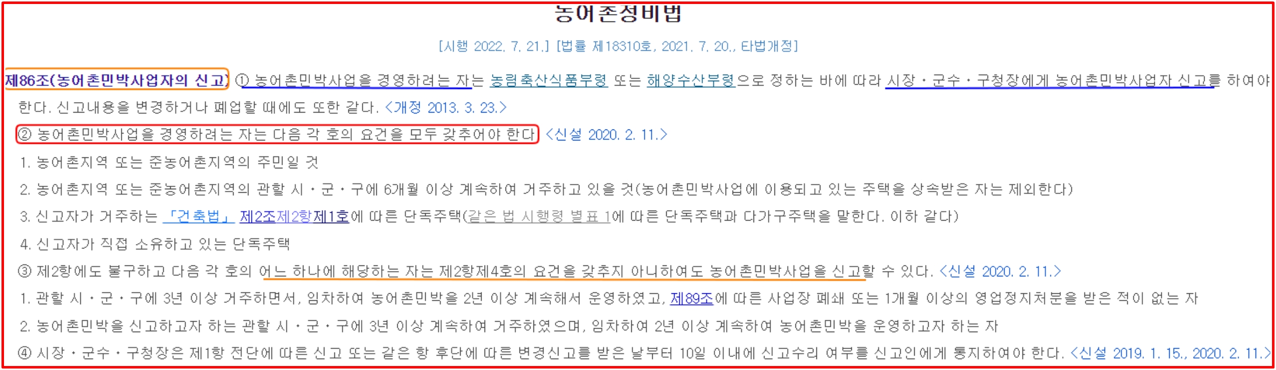 농어촌 민박사업을 시작하기 위하여는 일정 요건을 갖추고 있어야 하는데 이는 농어촌 정비법 제86조를 보면 자세하게 알 수 있습니다.