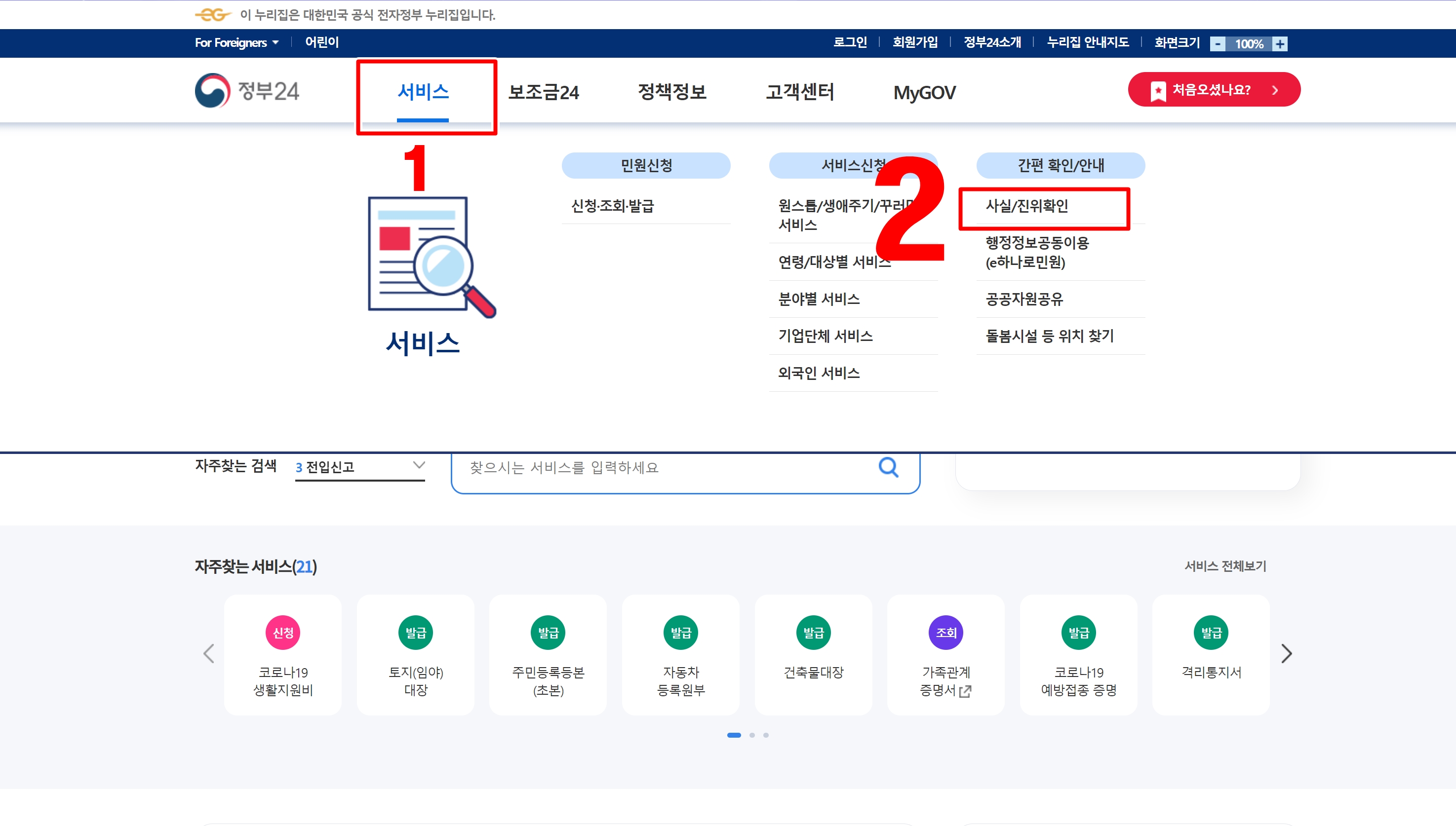 두 번째 방법으로는 정부 24 홈페이지를 활용하여 확인하는 방법입니다. 방법은 정부 24 사이트에 접속한 후 아래의 그림을 참고하시면 됩니다.