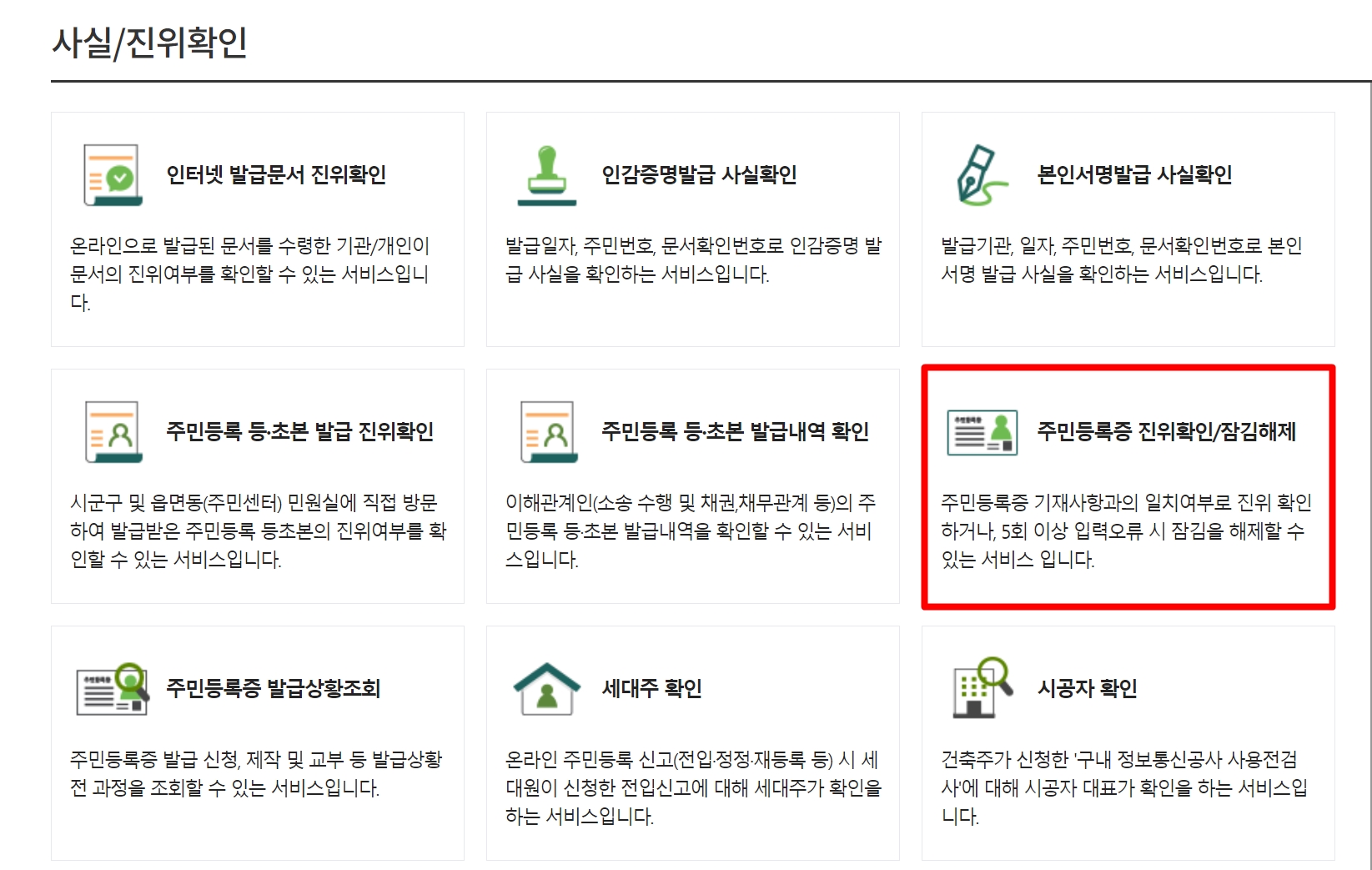 그러면 위와 같은 화면이 나오는데 메뉴 중 "주민등록증 진위확인/잠김 해제"를 선택해 줍니다.