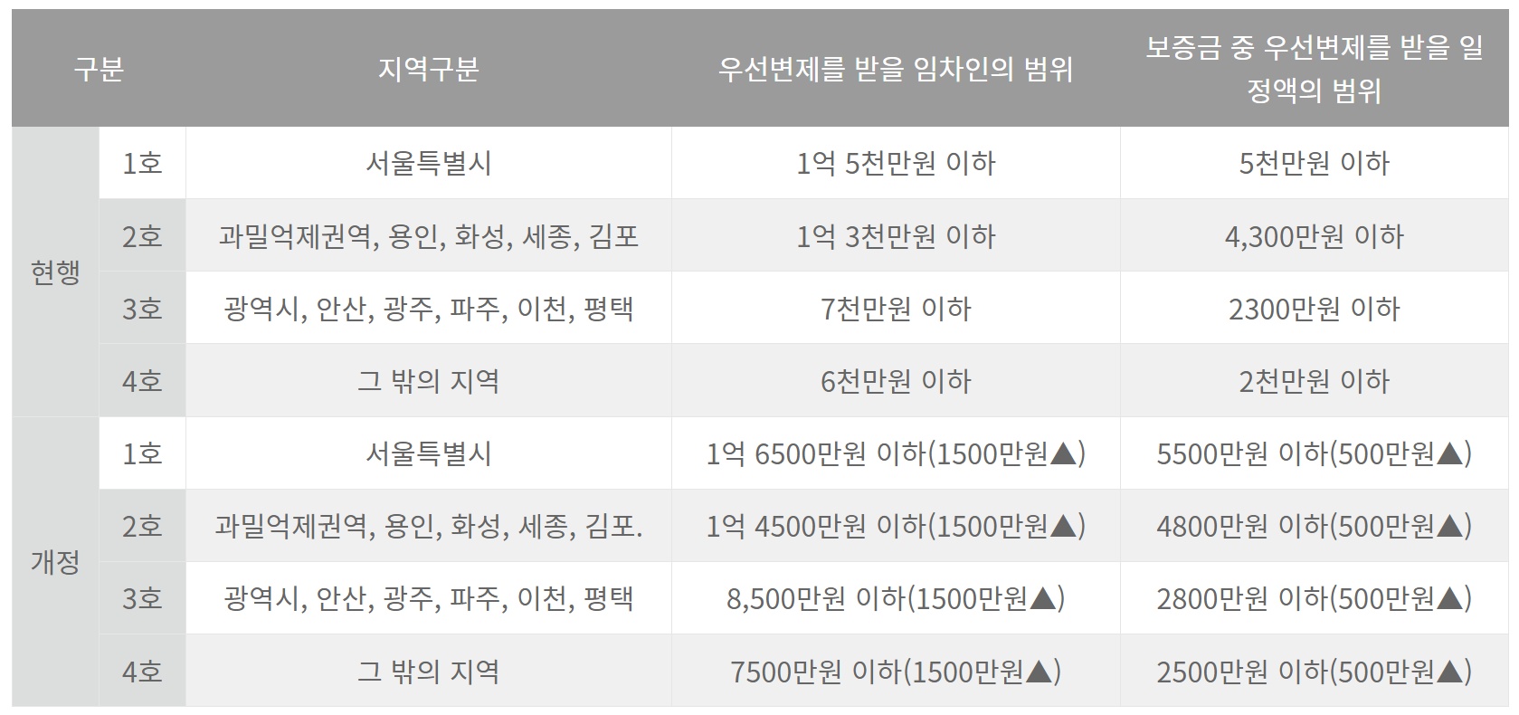 반면 최우선변제권을 주장하기 위해서는 경매신청 전까지 대항력을 갖추고 있으면 최우선변제금을 받을수 있으며, 모든 임차인에게 적용되는 것이 아니라 소액임차인에게만 적용되는 것입니다. 그리고 보증금 전액을 변제해 주는 것이 아니라 지역에 따라서 일정 금액만큼만 최우선으로 변제해 주는 것입니다.