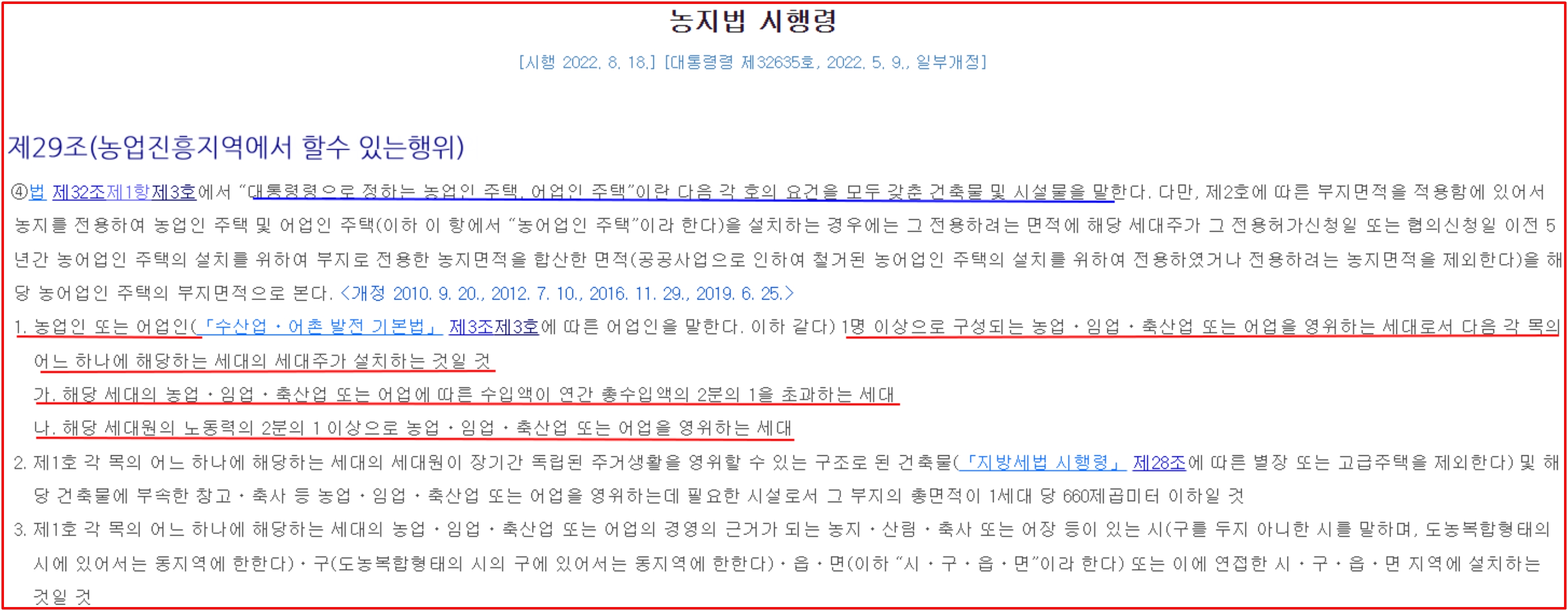 농업인이 무엇인지는 이제 아셨을 것입니다. 그러면 농업인이라면 누구나 농업인 주택을 지을 수 있을까요? 농업인 주택을 짓기위해서는 농지법 시행령 제 29조에 따른 조건을 만족해야 합니다.
